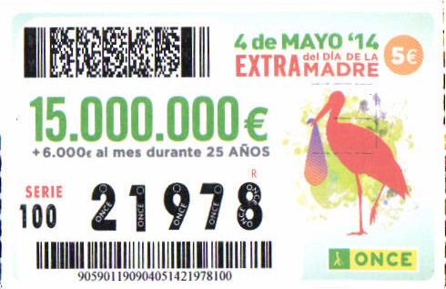 ÀÌ º¹±ÇÀº ½ºÆäÀÎÀÇ ¿Â¼¼ º¹±Ç±â±¸¿¡¼­ ¹ßÇàÇÏ´Â °ø½Ä º¹±ÇÀ¸·Î¼­ 2014³â 5¿ù 4ÀÏ ½ºÆäÀÎÀÇ ¾î¸Ó´Ï³¯¿¡ Ãß÷µË´Ï´Ù. ÀÌ º¹±ÇÀº 1µî ´ç÷ÀÚ¿¡°Ô´Â 15,000,000 À¯·Î(¾à 223¾ï 5õ¸¸¿ø)¿¡´Ù ¸Å´Þ 6õ À¯·Î(¾à 900¸¸¿ø)¸¦ 25³â°£ Áö±ÞÇÏ´Â ÀÏ½ÃºÒ Çö±Ý Áö±Þ ¹æ½Ä°ú ¿¬±Ý Áö±Þ ¹æ½ÄÀ» È¥ÇÕÇØ¼­ µå¸®´Â ²ÞÀÇ º¹±ÇÀÔ´Ï´Ù.